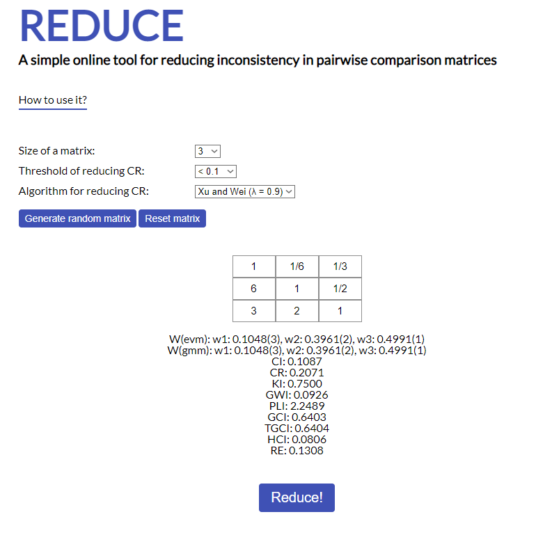 Celem artykułu jest przedstawienie REDUCE, bezpłatnego internetowego narzędzia wspomagającego podejmowanie decyzji w celu zmniejszenia niespójności w ramach porównań parami. Porównania parami (PC) stanowią popularną technikę podejmowania decyzji wielokryterialnych, jej celem jest przypisanie wag porównywanym podmiotom, a tym samym zapewnienie ich rankingu od najlepszych do najgorszych. Jednak porównania parami dostarczane przez ekspertów-ludzi są często niespójne. Niskie poziomy niezgodności, poniżej CR = 0,10, gdzie CR oznacza współczynnik spójności Saaty’ego, są zwykle tolerowane. Gdy niezgodność jest większa, PC muszą zostać zrewidowane. Może to stanowić problem w praktyce, ponieważ ekspert dostarczający oryginalne preferencje może być niedostępny lub istnieją inne przeszkody uniemożliwiające rewizję. REDUCE to autonomiczne narzędzie do redukcji niezgodności oparte na kilku algorytmach, które nie wymaga pomocy eksperta. Porównania parami (pełna macierz PC) stanowią dane wejściowe REDUCE. Następnie użytkownik określa, który algorytm ma zastosować i jaki poziom niespójności powinien zostać osiągnięty. Macierz PC wystarczająco spójna i zachowująca w maksymalnym stopniu pierwotne preferencje, tworzy wyjście REDUCE. Ponadto REDUCE umożliwia również obliczanie wag porównywanych obiektów, dzięki czemu można go w pewnym stopniu wykorzystać również w procesie hierarchii analitycznej (AHP). Wierzymy, że REDUCE może przyczynić się do lepszego podejmowania decyzji w przypadku porównań parami, ponieważ małych i średnich przedsiębiorstw zwykle nie stać na drogie oprogramowanie komercyjne i nie zatrudniają pełnoetatowych ekspertów w podejmowaniu decyzji, ponieważ polegają na doświadczeniu swoich pracowników i bezpłatnych zasobach online. Jest to również element architektury rozwoju innowacyjnych systemów komputerowych działającej zgodnie z ideą Przemysłu 4.0 wraz z metodami, algorytmami, wbudowanymi podsystemami oraz dedykowanym oprogramowaniem umożliwiającym wdrażanie inteligentnych systemów dla przedsiębiorstw i procesów.