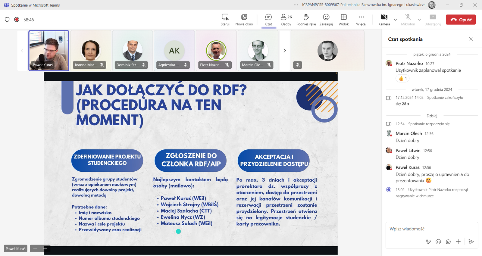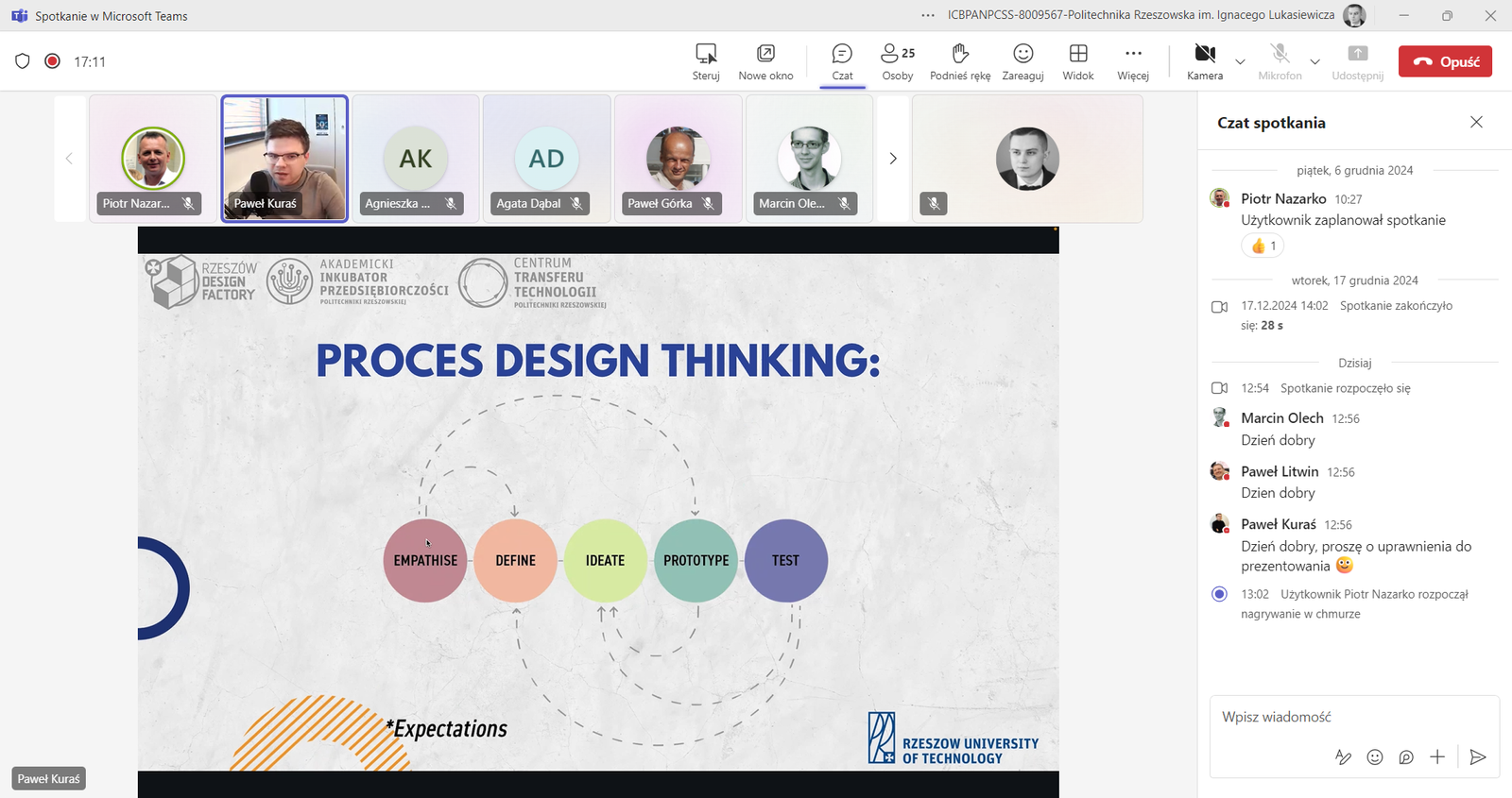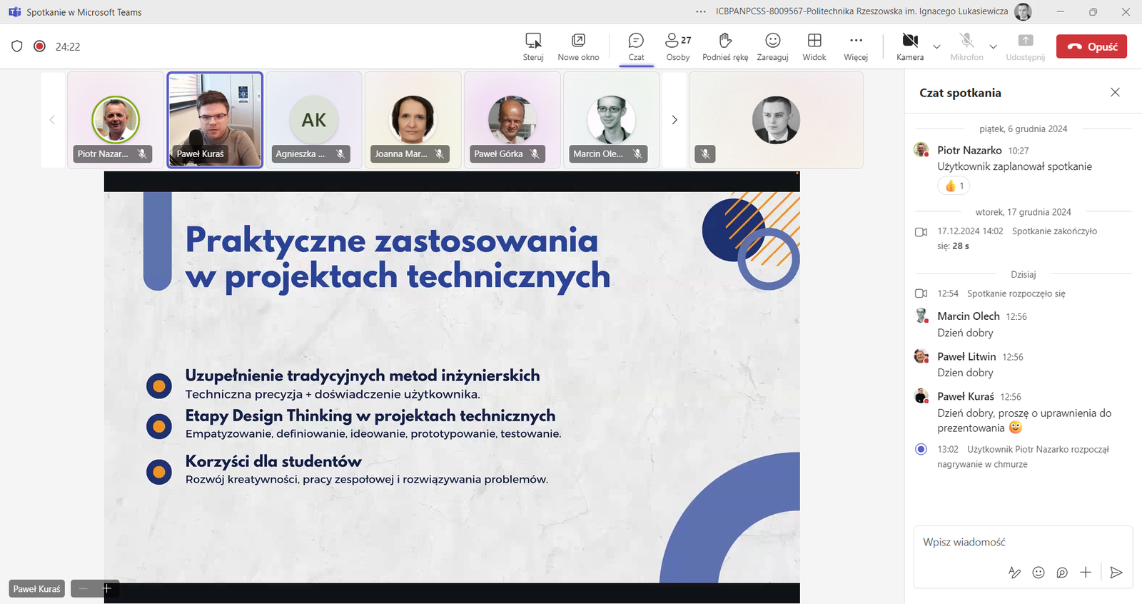 Dziś, 9 stycznia 2025 roku, odbyło się kolejne spotkanie w ramach cyklu „Dydaktyczne Czwartki”. Dr inż. Paweł Kuraś przedstawił praktyczne zastosowanie metodologii Design Thinking w procesie kształcenia, szczególną uwagę poświęcając realizacji projektów studenckich.