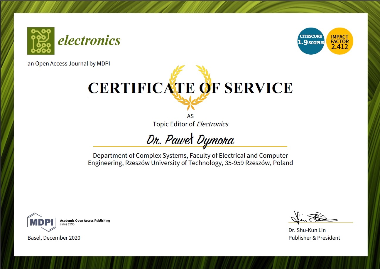 Dr inż. Paweł Dymora został mianowany na stanowisko Redaktora Tematycznego (dwuletnia kadencja) w międzynarodowym, recenzowanym czasopiśmie Electronics (ISSN 2079-9292, Impact Factor 2.412) o otwartym dostępie, wydawanym przez MDPI. Głównym zadaniem Redaktora Tematycznego jest kierowanie procesem wydawniczym wybranych edycji czasopisma - Special Issues, w tym rekomendowanie i recenzowanie prac badawczo-naukowych.