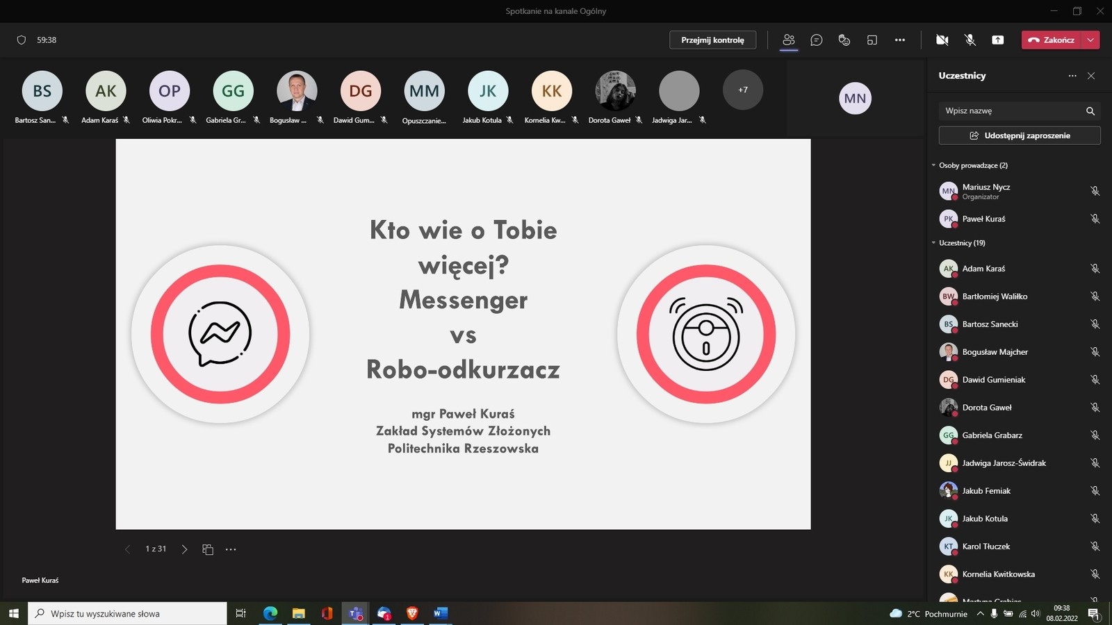 - 9:45 – 10:30, mgr inż. Paweł Kuraś, asystent Politechnika Rzeszowska - "Kto wie o Tobie więcej - robot-odkurzacz czy Facebook Messenger?" – absolwent ZSL w Leżajsku.