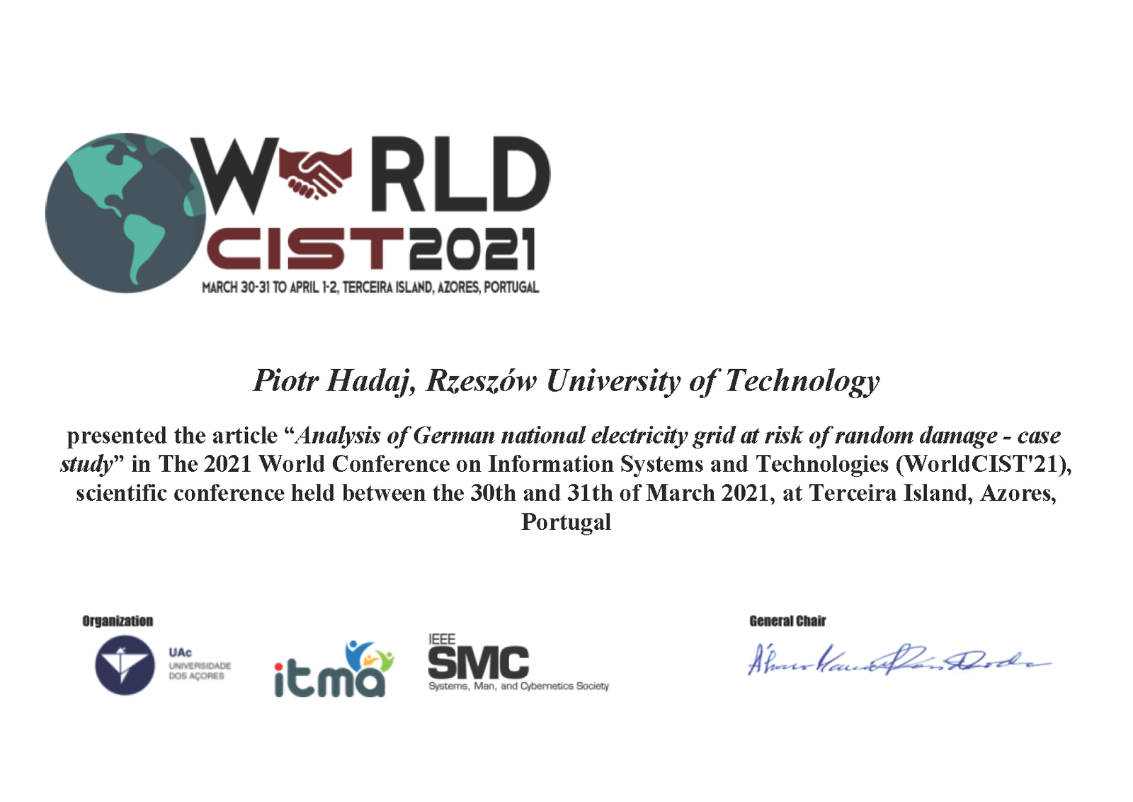 W środę 31.03.2021 r. mgr inż. Piotr Hadaj wygłosił referat podczas 9. Międzynarodowej Konferencji - WorldCist'21,