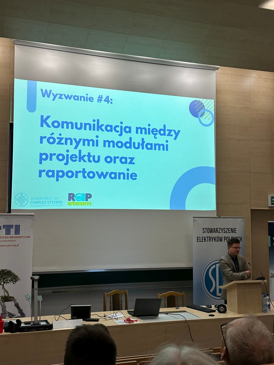 Prelekcję pt. „Wyzwania i rozwiązania techniczne przy budowie RaP STEAM – platformy do nauki robotyki i programowania w szkołach podstawowych z terenu województwa podkarpackiego” wygłosili mgr inż. Paweł Kuraś oraz dr hab. inż., Dominik Strzałka prof. PRz z Zakładu Systemów Złożonych PRz.