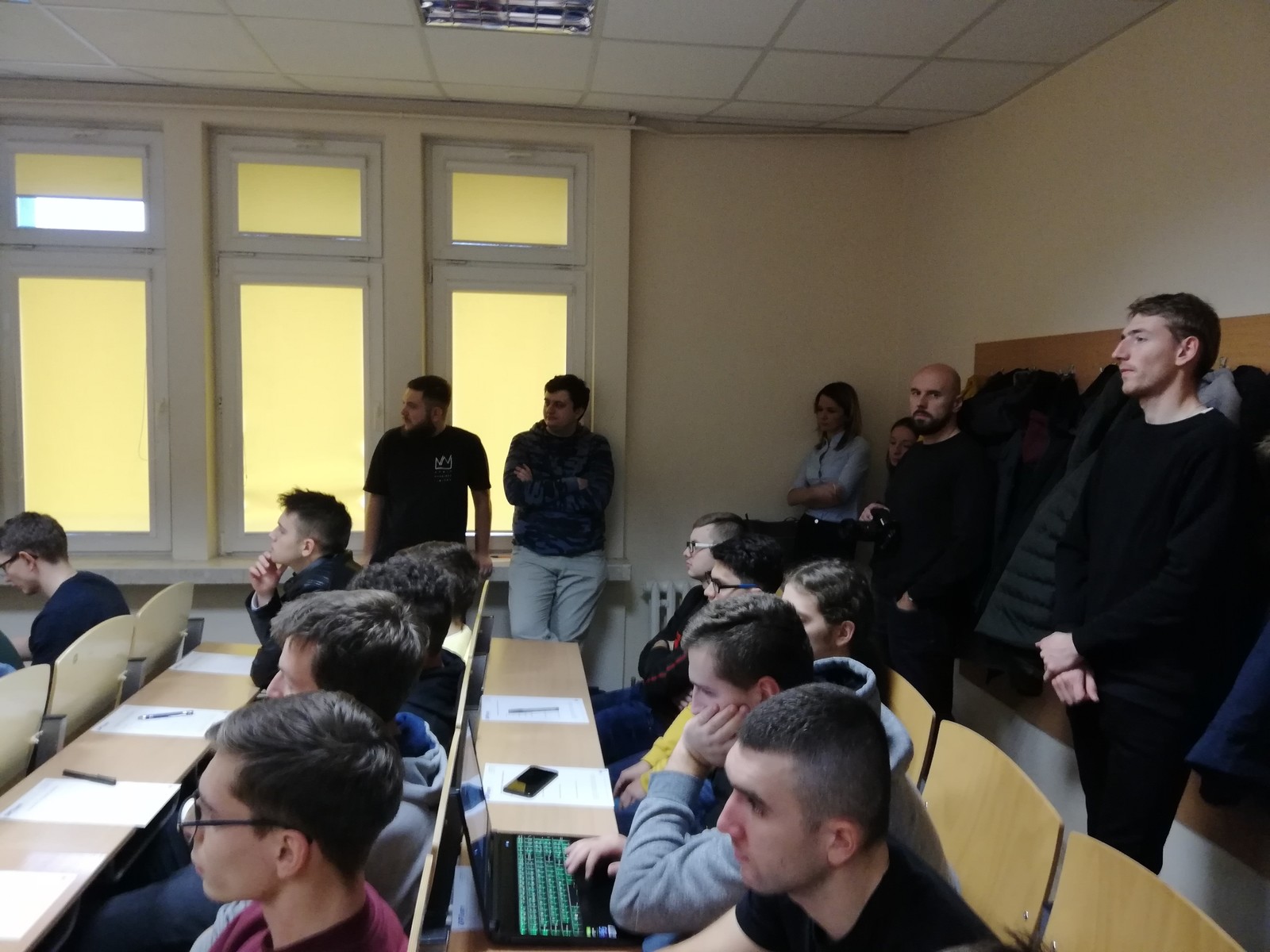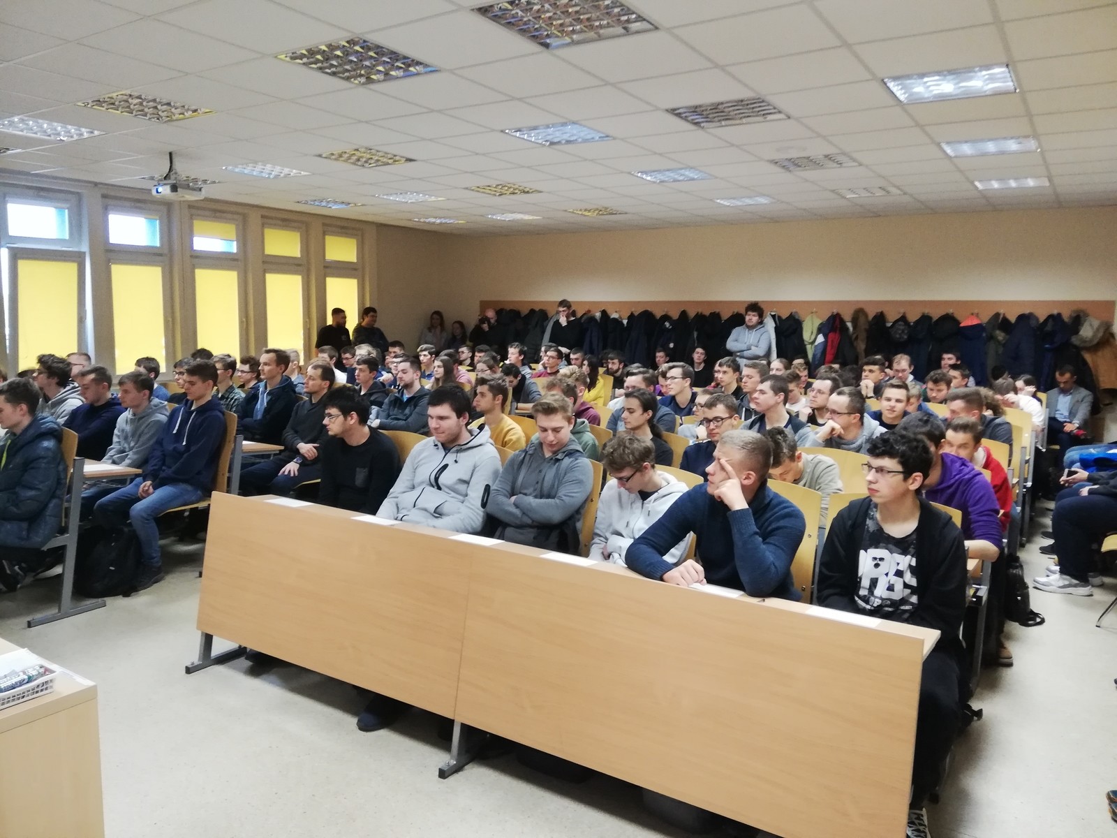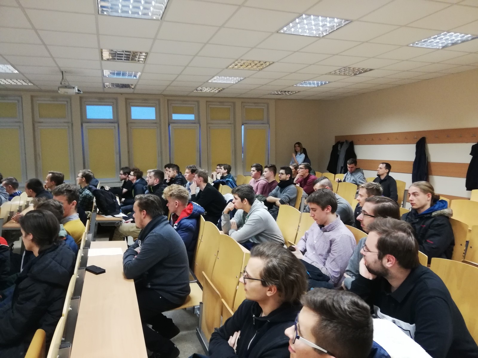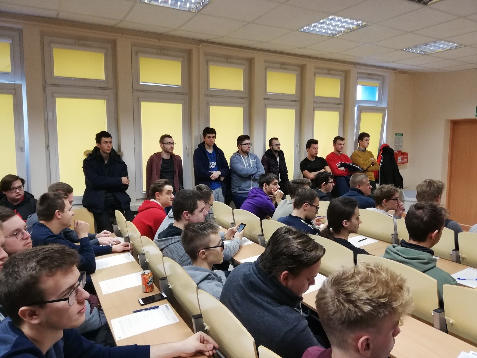 Podczas spotkania eksperci OPTeam prezentowali zagadnienia związane z użyciem BOTów konwersacyjnych w procesie komunikacji studentów z uczelnią, np. w systemie USOS. NA spotkaniu było prawie 120 studentów WEiI.