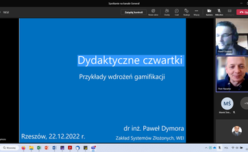 W dniu 22.12.2022 r. dr inż. Paweł Dymora, pracownik ZSZ w ramach inicjatywy pt. Dydaktyczne czwartki na PRz przedstawił prezentację pt. Przykłady wdrożeń gamifikacji.