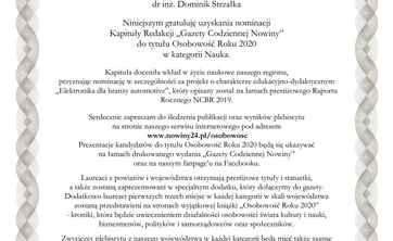 Gazety Nowiny ogłosiła konkurs na Osobowość Roku 2020. Jedną z osób nominowanych w kategorii nauka jest nasz kolega, dr Dominik Strzałka, za realizację projektu Elektronika dla branży automotive.