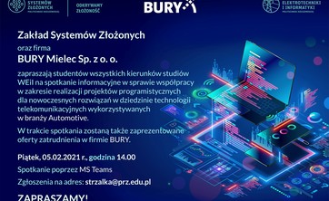 Zakład Systemów Złożonych oraz firma Bury Mielec Sp. z o.o. zapraszają studentów wszystkich kierunków studiów WEiI na spotkanie w Piątek, 05.02.2021 r., o godzinie 14.00.