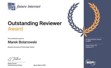 Redakcja czasopisma MDPI Future Internet wyróżniła po raz kolejny pracownika Zakładu Systemów Złożonych Dr inż. Marka Bolanowskiego prof. PRz za jakość recenzji.