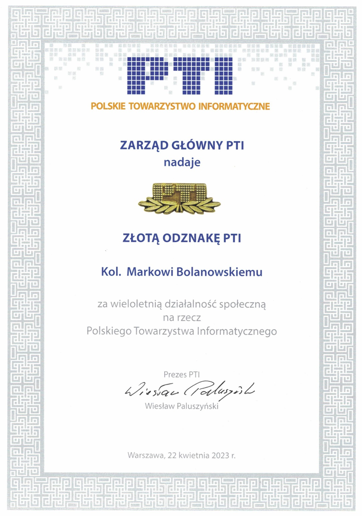 W trakcie Zjazdu dr inż. Marek Bolanowski został wyróżniony najwyższą Złotą Odznaką PTI za wieloletnią działalność społeczną na rzecz Polskiego Towarzystwa Informatycznego.