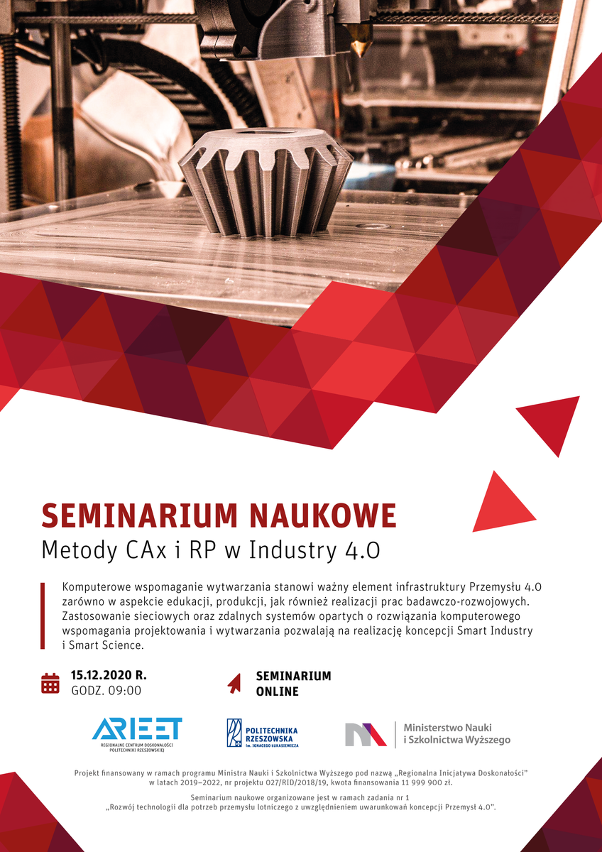 15 grudnia 2020r. odbyło się seminarium naukowe w ramach współpracy zespołów badawczych Politechniki Rzeszowskiej z otoczeniem społeczno-gospodarczym. Seminarium dotyczyło zagadnień: komputerowo wspomaganego wytwarzania oraz rozwoju technologii szybkiego prototypowania opartych na wytwarzaniu przyrostowym. Oba te obszary stanowią ważny element Przemysłu 4.0, a także są związane z intensywnym rozwojem gałęzi gospodarki odnoszących się do wysokich technologii, ujętych m.in. w Regionalnych Inteligentnych Specjalizacjach zdefiniowanych dla województwa podkarpackiego, takich jak lotnictwo i kosmonautyka oraz motoryzacja. Spoiwem łączącym wskazane specjalizacje i umożliwiającym urzeczywistnienie koncepcji Przemysł 4.0 są systemy informatyczne i telekomunikacja.