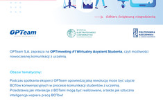 Podczas spotkania eksperci OPTeam opowiedzą jaką rewolucją może być użycie BOTów konwersacyjnych w procesie komunikacji studentów z uczelnią. Przedstawią jak interakcje z BOTami mogą być realizowane, a także jak sztuczna inteligencja wspiera pracę BOTów!