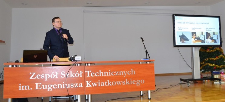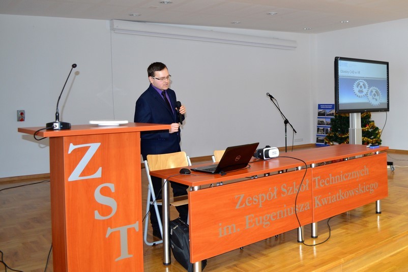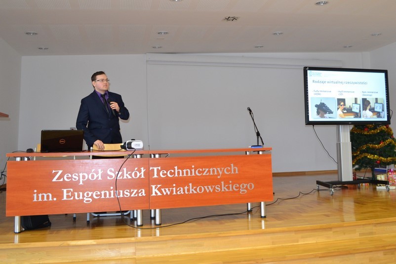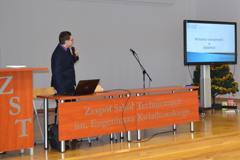 W dniu 11 stycznia mgr inż. Bartosz Kowal w ramach współpracy między Politechnika Rzeszowską, a Zespołem Szkół Technicznych im. E. Kwiatkowskiego w Rzeszowie wygłosił krótki wykład na temat zastosowań Wirtualnej Rzeczywistości w dydaktyce i przemyśle 4.0.