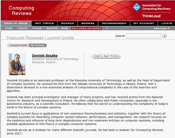 Dr inż. Dominik Strzałka został wyróżniony przez czasopismo Computing Reviews jako Featured Reviewer. Computing Reviews (CR) to wydawnictwo Association for Computing Machinery, które ma na celu zapewnienie dostępu do aktualnych badań, teorii i zastosowań we wszystkich obszarach informatyki poprzez publikowanie recenzji najnowszych artykułów, materiałów konferencyjnych oraz książek. Recenzenci i eksperci współpracujący z CR opracowują bezstronne i krytyczne recenzje aktualnych i ważnych publikacji w informatyce. Celem CR jest przedstawienie przeglądu rozwoju informatyki specjalistom, którzy chcą mieć aktualny ogląd na tę dziedzinę jako całość, wskazywać i naświetlać wysokiej jakości publikacje oraz budować i wzmacniać społeczność informatyków i innych zespołów poprzez promowanie wymiany pomysłów.