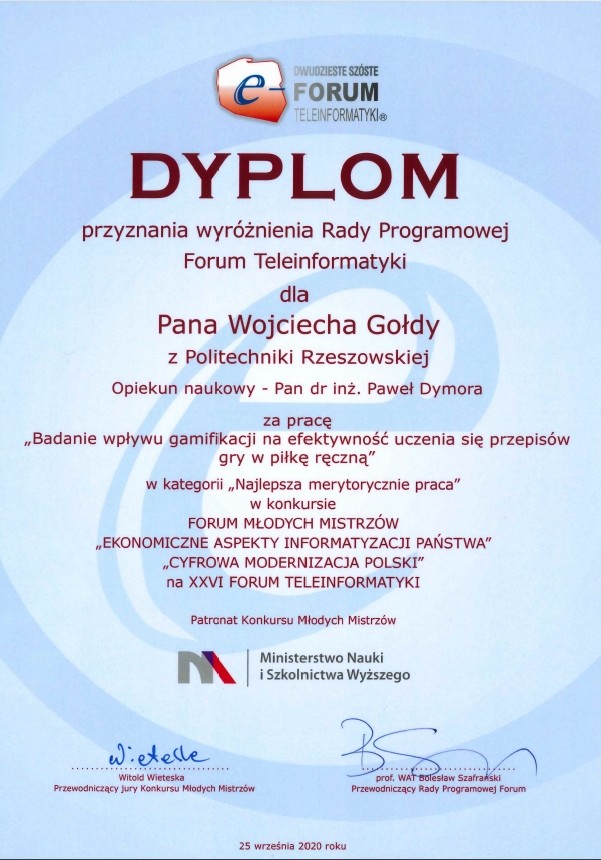 Praca dyplomanta p. Wojciecha Gołdy została wyróżniona podczas Forum Młodych Mistrzów – „Ekonomiczne aspekty informatyzacji państwa” na XXVI Forum Teleinformatyki za pracę "Badanie wpływy gamifikacji na efektywność uczenia się przepisów gry w piłkę ręczną".