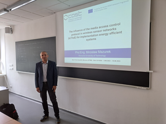 Celem stażu było nawiązanie współpracy z Brno University of Technology w zakresie badań nad samorekonfigurowalnymi algorytmami routingu w bezprzewodowych sieciach sensorowych, ze szczególnym uwzględnieniem optymalizacji ich efektywności energetycznej. Ponadto ważną częścią badań będzie również wykorzystanie mechanizmów Process Mining i Process Discovery w odkrywaniu przepływu danych i wzorców procesów, które mogą wpływać na dynamiczne wzorce komunikacji i logiczne sekwencje realizacji procesów biznesowych lub produkcyjnych. Takie działania są częścią szerokiego kontekstu monitorowania stanu konstrukcji, ze szczególnym uwzględnieniem samolotów i monitorowania ich kluczowych parametrów. Dr inż. Paweł Dymora oraz dr inż. Mirosław Mazurek podczas realizowanych seminariów naukowych przeprowadzili dwa otwarte wykłady dla pracowników i studentów Uniwersytetu jak również zaprezentowali Wydział oraz Politechnikę Rzeszowską. Wśród licznie przybyłych uczestników seminariów naukowych, dużą grupę stanowili pracownicy Wydziału informatyki oraz lotnictwa. Stażyści mieli również okazję zapoznać się z bogatą bazą naukowo-dydaktyczną Brno University of Technology, w szczególności z laboratoriami:
