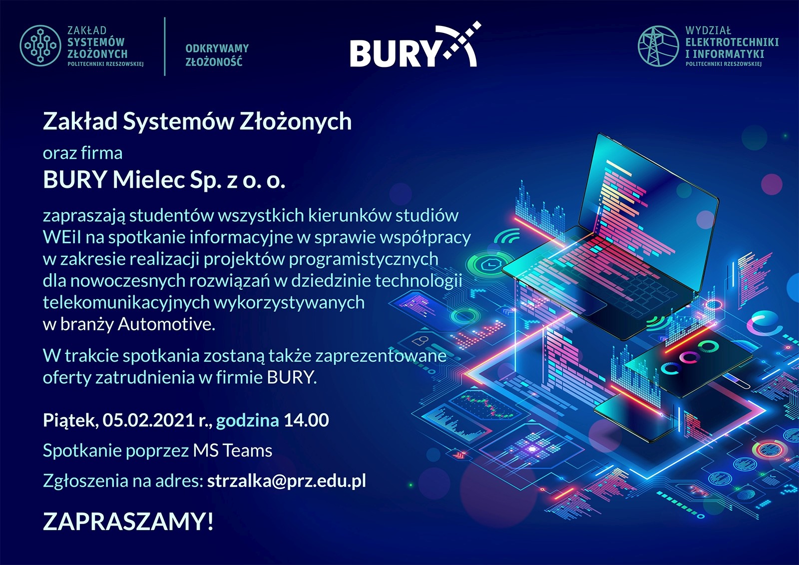 Zakład Systemów Złożonych oraz firma Bury Mielec Sp. z o.o. zapraszają studentów wszystkich kierunków studiów WEiI na spotkanie informacyjne w sprawie współpracy w zakresie realizacji projektów programistycznych dla nowoczesnych rozwiązań w dziedzinie technologii telekomunikacyjnych wykorzystywanych w branży Automotive. W czasie spotkanie zastaną przedstawione także oferty zatrudnienia w firmie Bury.