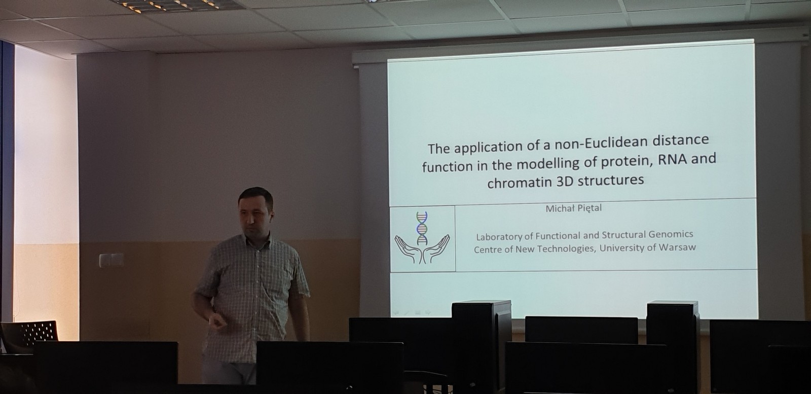 Using the invitation dr Michał Piętal gave a lecture entitled "Application of a non-Euclidean distance function in modelling of protein, RNA and chromatin 3D structures"